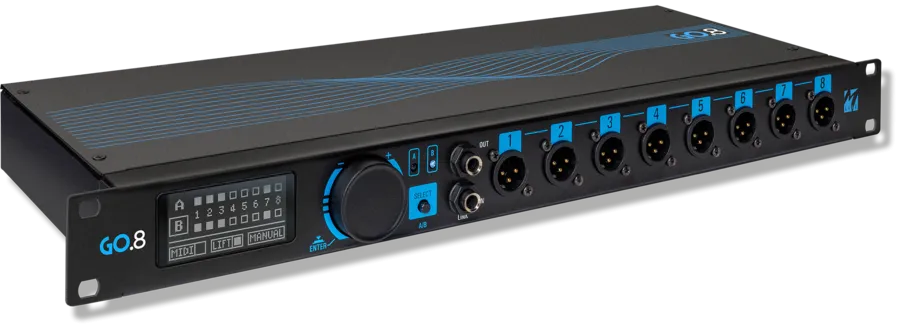 GO.8 är en automatisk växlare för backup av ljud, video och MIDI. Den kan automatiskt växla mellan två ljudsystem med 8 kanaler vardera, två videokällor och två MIDI-enheter. GO.8 är perfekt för konserter och teaterföreställningar där ljud och bild måste fungera.