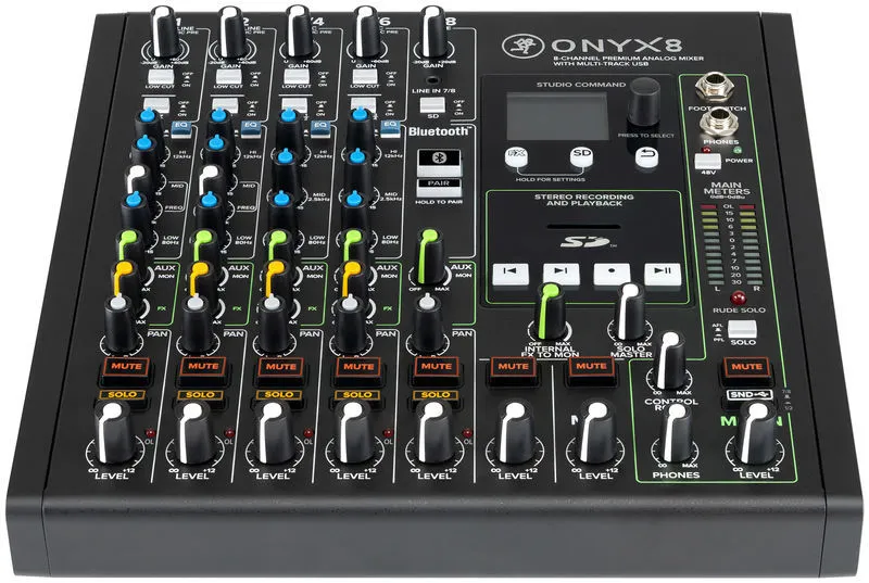 Mackie Onyx8 - 8-channel mixer; 4 microphone inputs with 100Hz Low-cut and 48V phantom power; gain up to 60 dB; 4-band EQ on channels 1 and 2; 3-band EQ on channels 3-6; Hi-Z inputs for guitar, bass and other instruments; 24 bit/ 96 kHz multi-track recording (8 tracks via USB on MAC/PC); stereo recording on SD card; One-touch recording possible; assignable USB return; playback via SD possible; 1x mini jack input; Bluetooth streaming; up to 6 storable user presets; built-in effects processor with adjustable parameters and its own EQ; LED level meter; separate control room output; monitor output; 6.3 mm headphone output; PFL/AFL solo; mute button per channel; full color display; incl. Pro Tools First with The Musician Collection PlugIn Bundle, Waveform OEM with DAW Essentials Bundle;