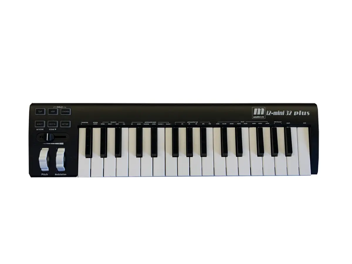 i2-Mini 32 Plus är ett USB-masterkeyboard i ultrakompakt format med medelstora tangenter. Tangenterna är mindre än traditionella pianotangenter men större än vanliga minitangenter, vilket ger en mer bekväm spelkänsla samtidigt som klaviaturen förblir kompakt och idealisk för mobil användning.