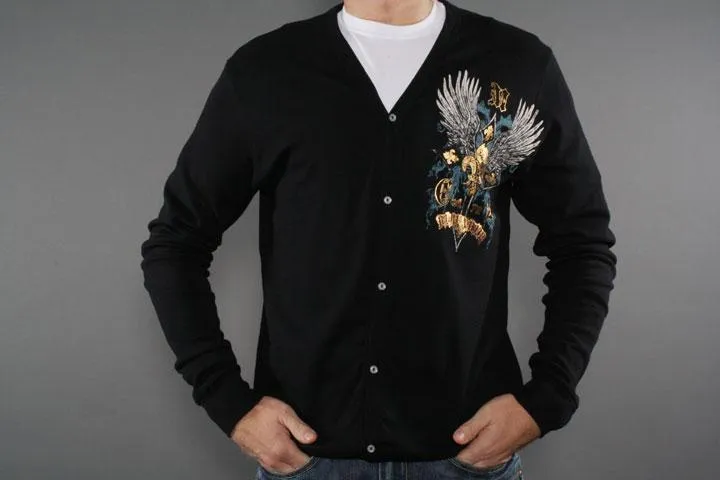 Trendig och cool cardigan i svart med tryck på vänster sida av bröstet samt stort tryck på ryggen i bl.a. guldfolie. Svart, small.