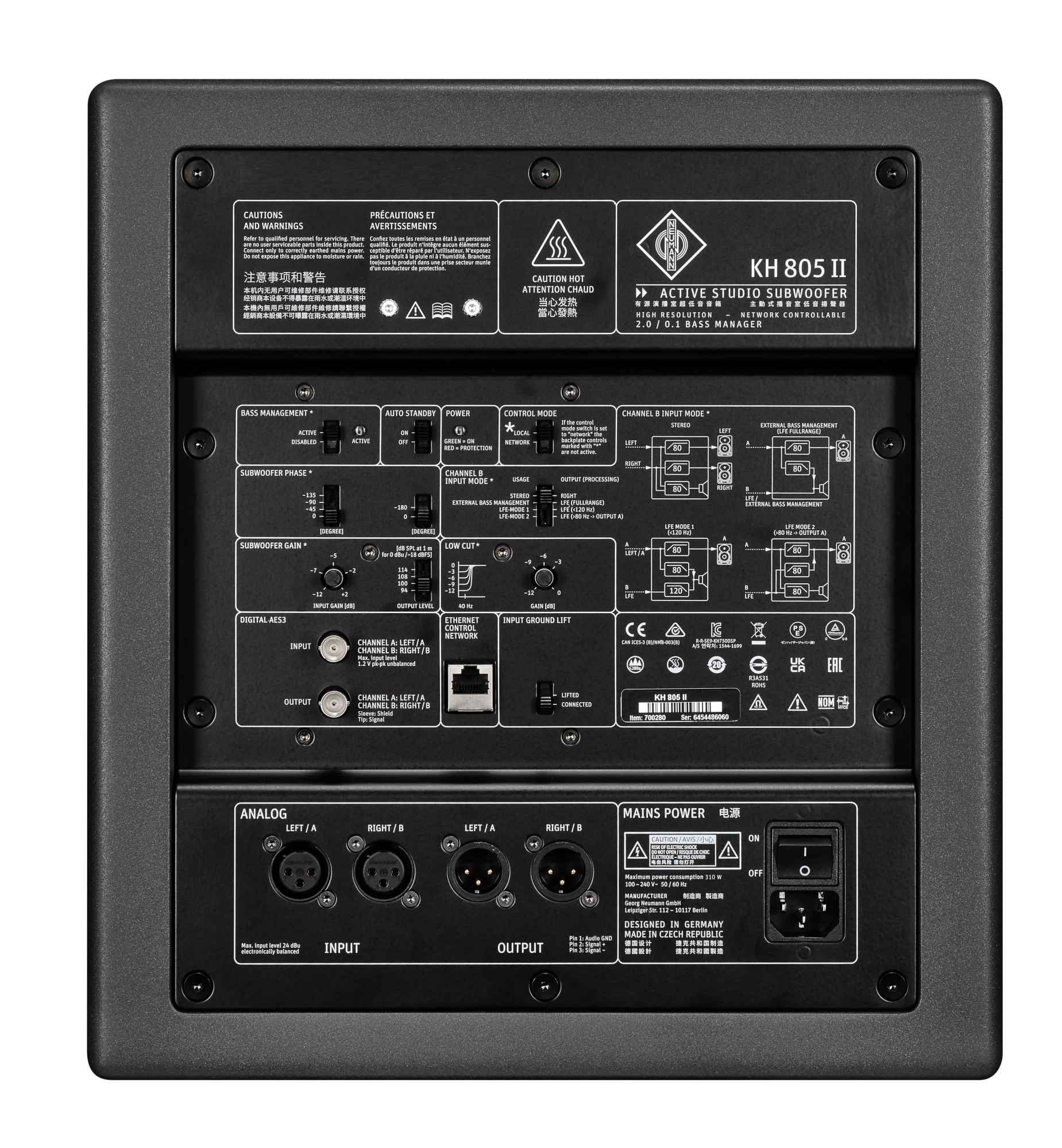 Neumann KH 805 II är en professionell DSP-styrd subwoofer för medelstora kontrollrum, utvecklad för exakt och kraftfull basshantering i musikproduktion, broadcast, postproduktion och mastering. Med en innovativ 10-tums långslagig basenhet utrustad med ELFF™-teknologi och intelligenta skyddslimitarer levererar den djup, precis och lågdistorderad bas ända ner till 16 Hz. KH 805 II har både analoga och digitala anslutningar för flexibel integration i både traditionella och moderna system och ett unikt och flexibelt bass manager-system för stereo, surround och immersive uppställningar. MA 1 automatisk monitorjustering (säljs separat) möjliggör sömlös kalibrering av hela monitoruppställningen tillsammans med Neumann-studiomonitorer.