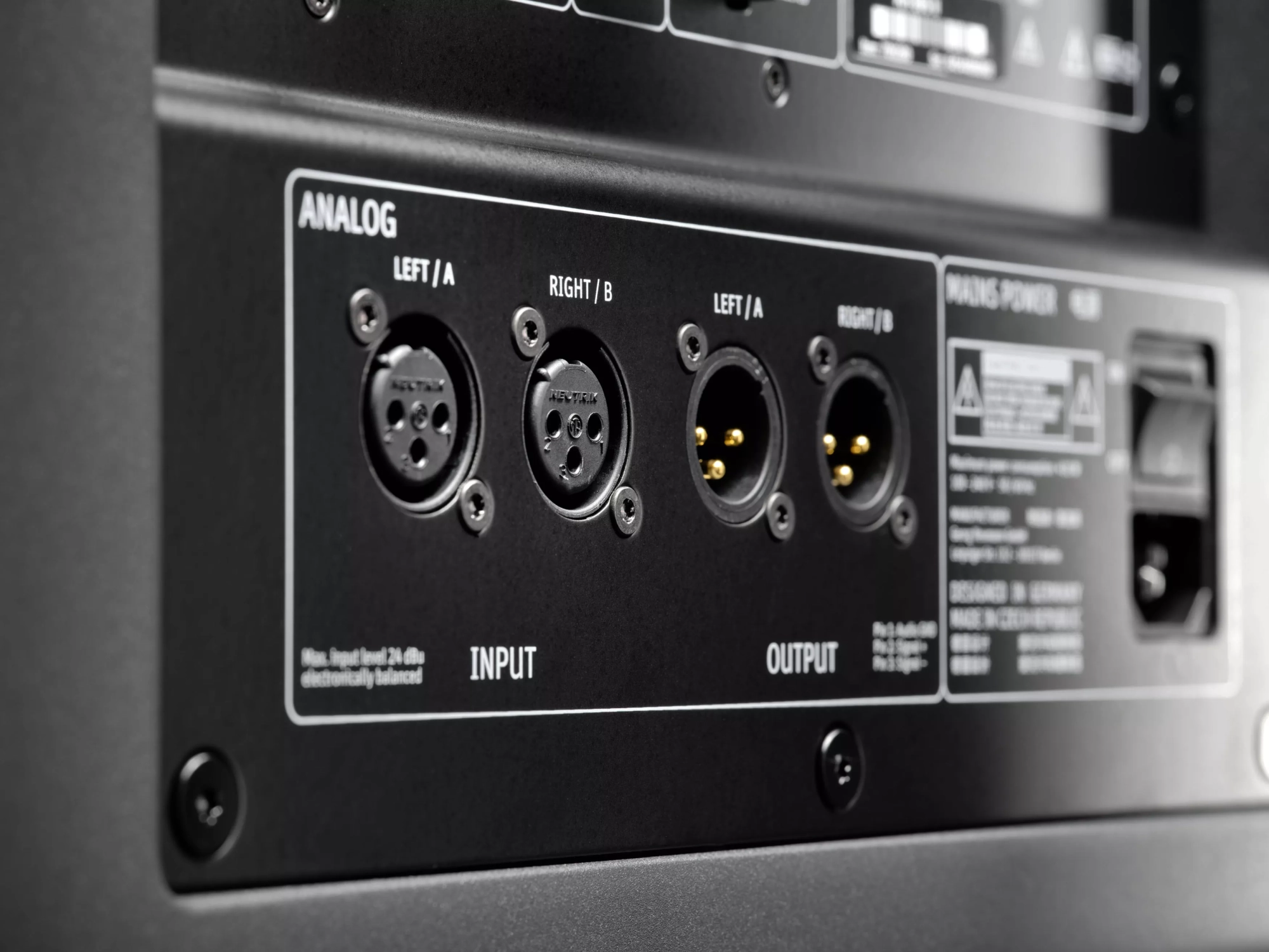 Analoga XLR-ingångar och -utgångar för robust och balanserad signalöverföring.