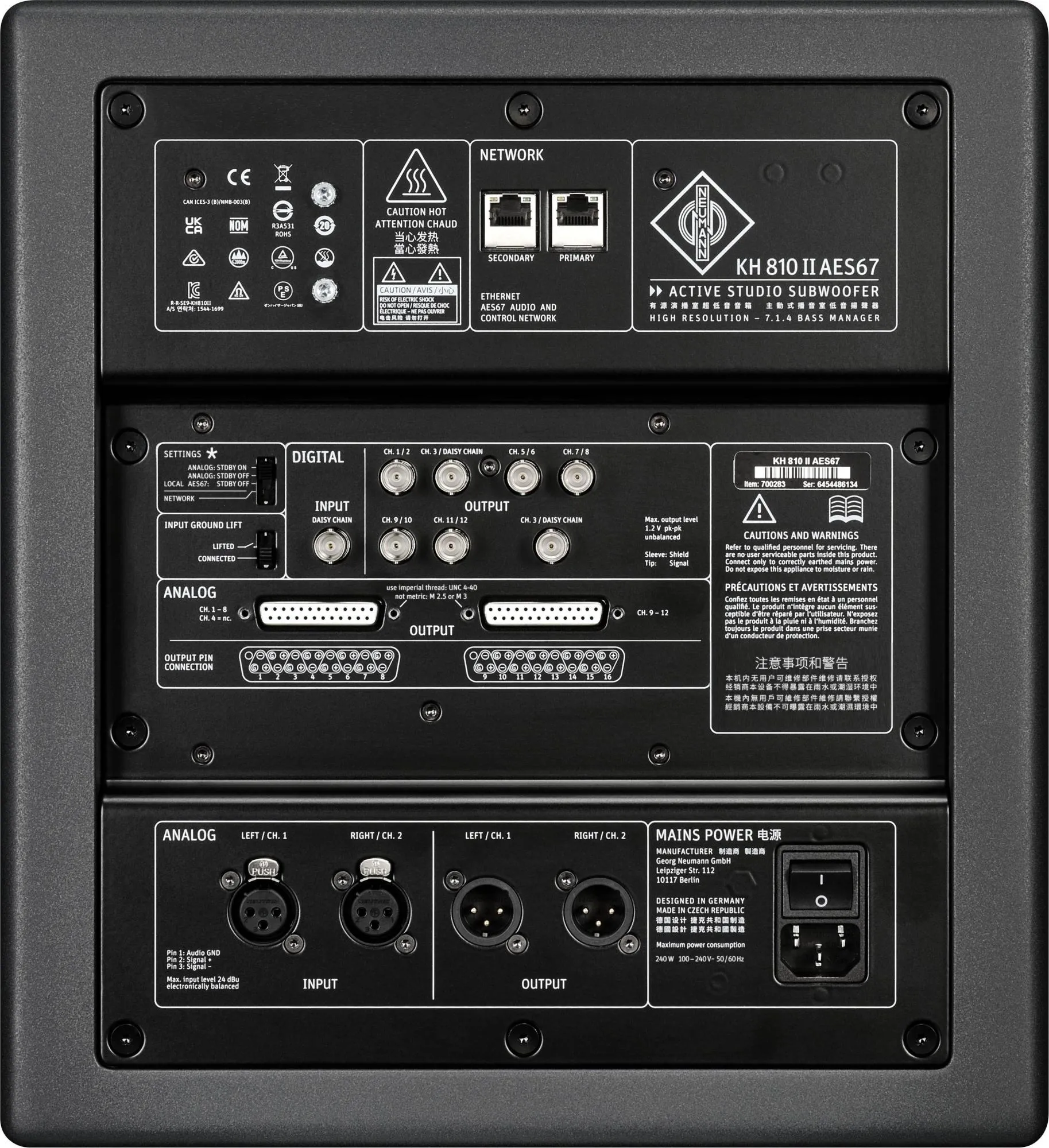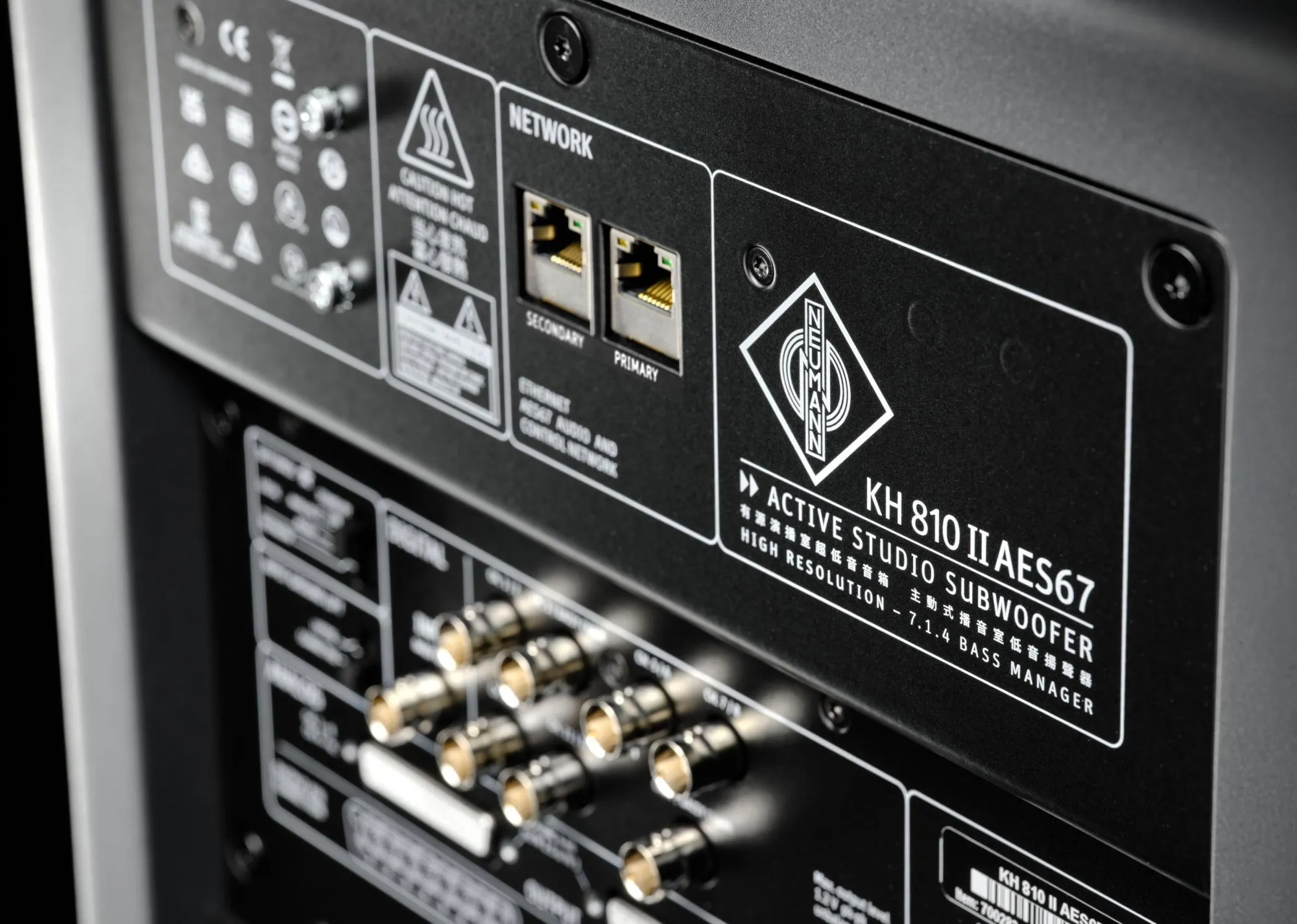 Neumann KH 810 II AES67 är en professionell DSP-styrd subwoofer med Audio-over-IP-anslutning (AES67) utvecklad för medelstora kontrollrum och immersiva ljudsystem såsom surround och Dolby Atmos. Subwoofern kombinerar en 10-tums långslagig basenhet med Extremely Linear Force Factor (ELFF™)-teknologi med avancerad DSP-kontroll och ett flexibelt bass manager-system som klarar upp till 7.1.4-konfigurationer. Med redundanta AES67-nätverksportar för AoIP-ljud med upp till 12 kanaler, analoga XLR- och multikanalsutgångar, samt digitala AES3-utgångar, ger den sömlös integrering i moderna broadcast-, post- och musikproduktionsmiljöer och fungerar som ett nav i hela monitoreringssystemet.