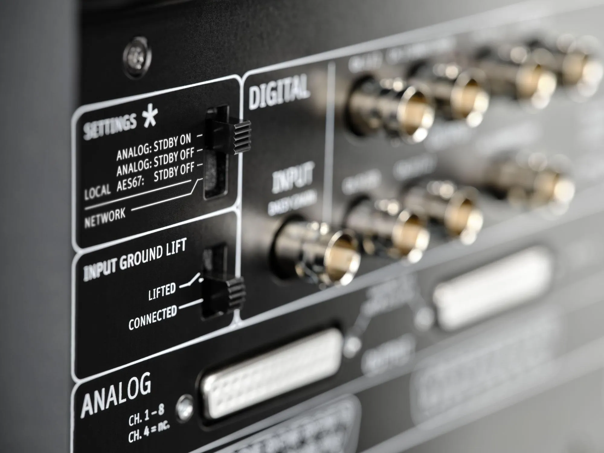 Balanserade analoga XLR- och SUB-D25-anslutningar för multikanals I/O.