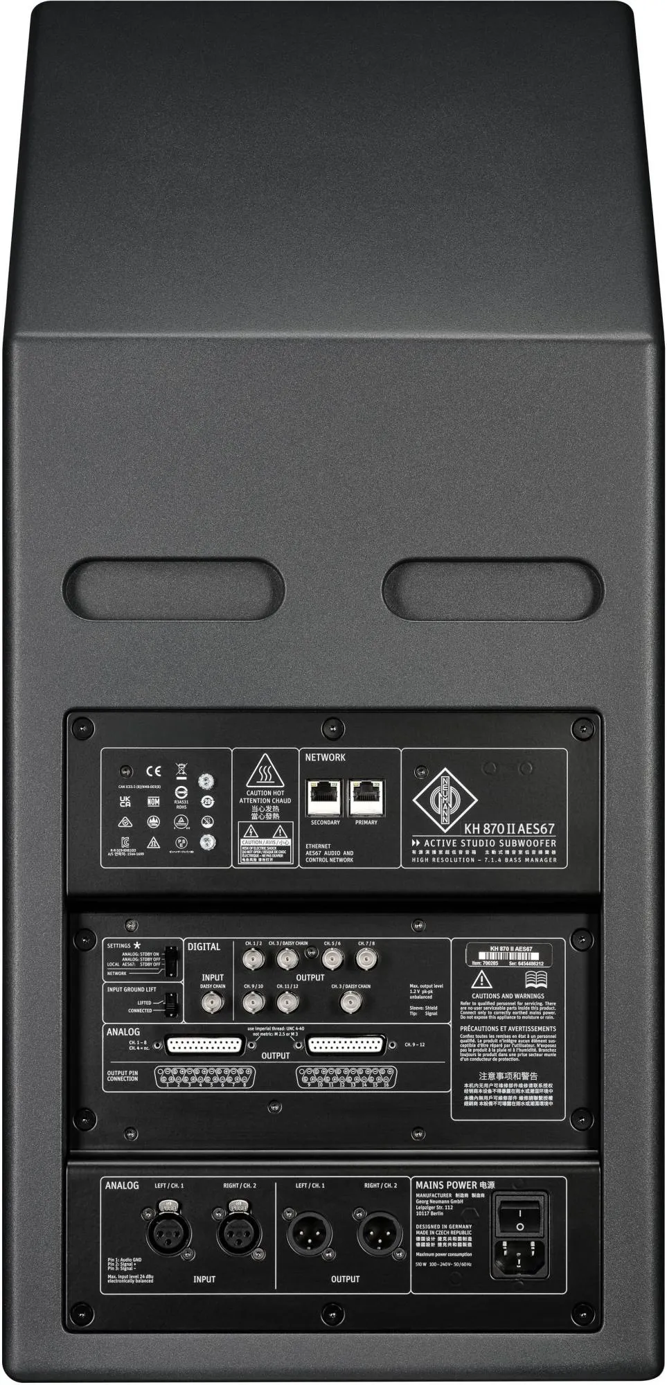 Neumann KH 870 II AES67 är en professionell DSP-styrd subwoofer med Audio-over-IP (AES67), utvecklad för stora kontrollrum och avancerade immersiva ljudsystem upp till 7.1.4. Den är utrustad med två långslagiga 10-tums baselement med Extremely Linear Force Factor-teknologi (ELFF™) som ger djup, exakt och lågdistorderad basåtergivning ner till 16 Hz. Ett kraftfullt multikanals bass management-system gör KH 870 II AES67 till ett centralt nav i moderna studio-, broadcast- och postproduktionsmiljöer. Stöd för Neumann MA 1 Automatic Monitor Alignment möjliggör exakt rumskorrektion och optimal integration i kompletta monitorsystem.