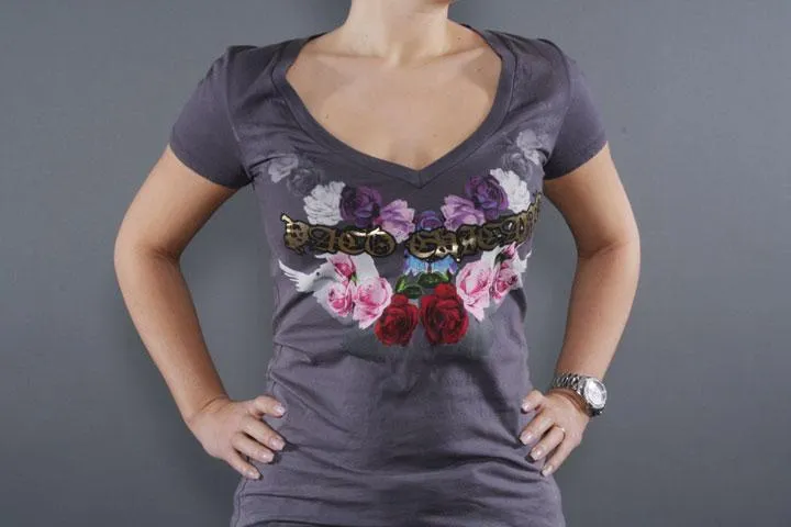 Grå topp med tryck framtill och baktill samt detaljer i guldfolie. Dam, Grå, medium. Paco Chicano by Christian Audigier.