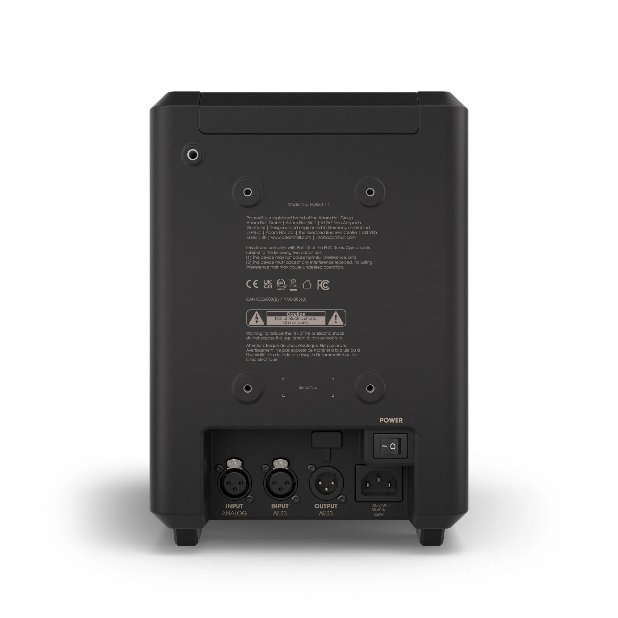 Intern processing sker vid 96 kHz/24-bit med FIR-filter för linjär fas och minimal latency. En användarvänlig kontrollpanel på ovansidan ger snabb åtkomst till ingångsreglage, 3-bands EQ, olika preset-lägen för desk och väggplacering samt ett högpassfilter på 80 Hz. Anslutningar inkluderar balanserad XLR line-in och AES3 via XLR, med AES3 Thru för kedjeanslutning.