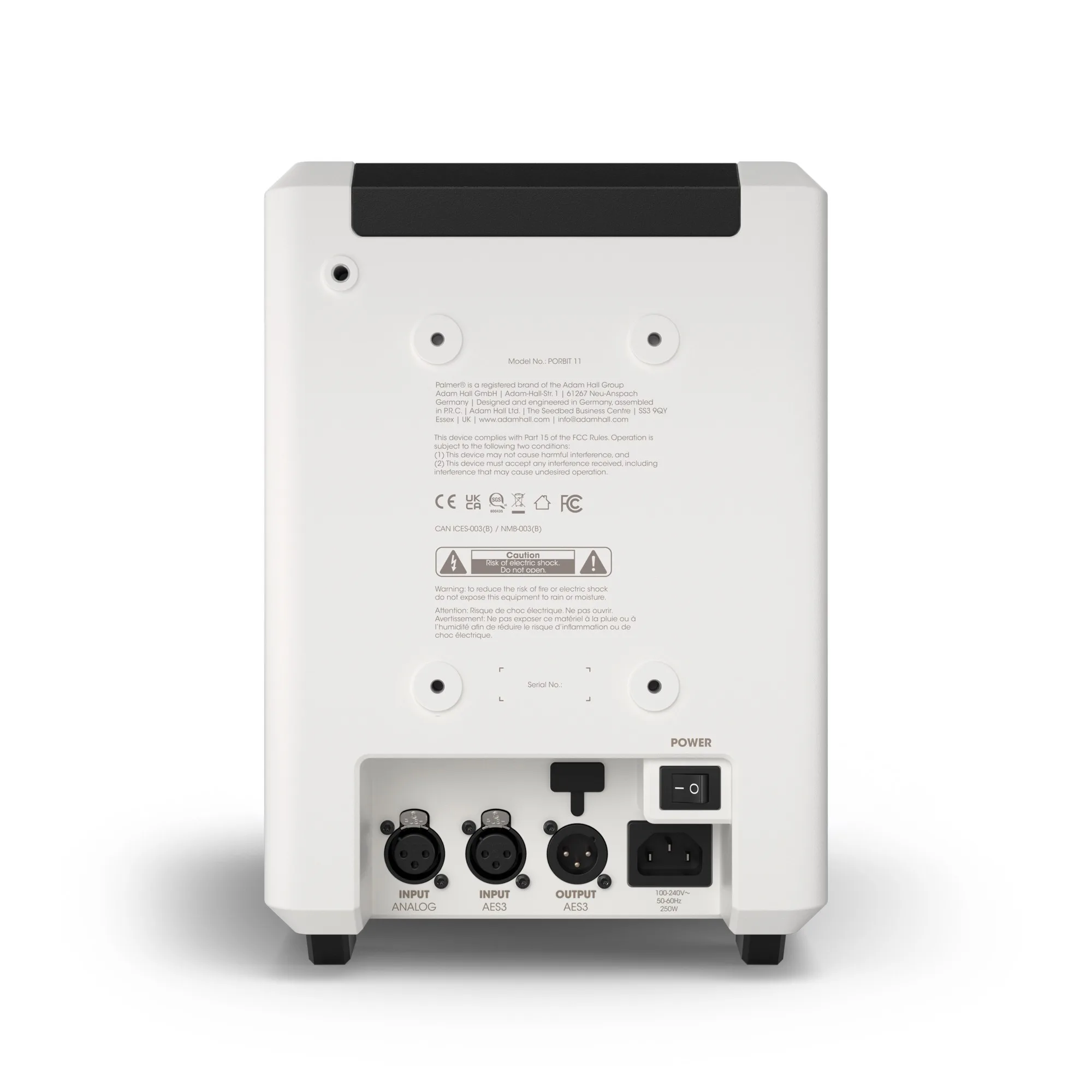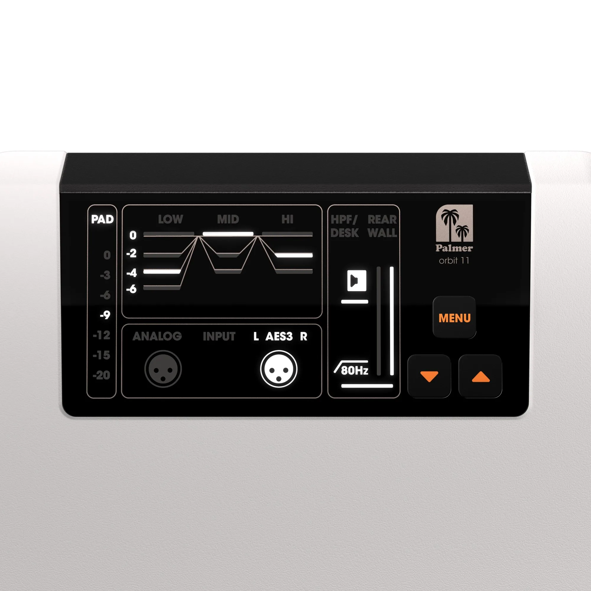 Intern processing sker vid 96 kHz/24-bit med FIR-filter för linjär fas och minimal latency. En användarvänlig kontrollpanel på ovansidan ger snabb åtkomst till ingångsreglage, 3-bands EQ, olika preset-lägen för desk och väggplacering samt ett högpassfilter på 80 Hz. Anslutningar inkluderar balanserad XLR line-in och AES3 via XLR, med AES3 Thru för kedjeanslutning.