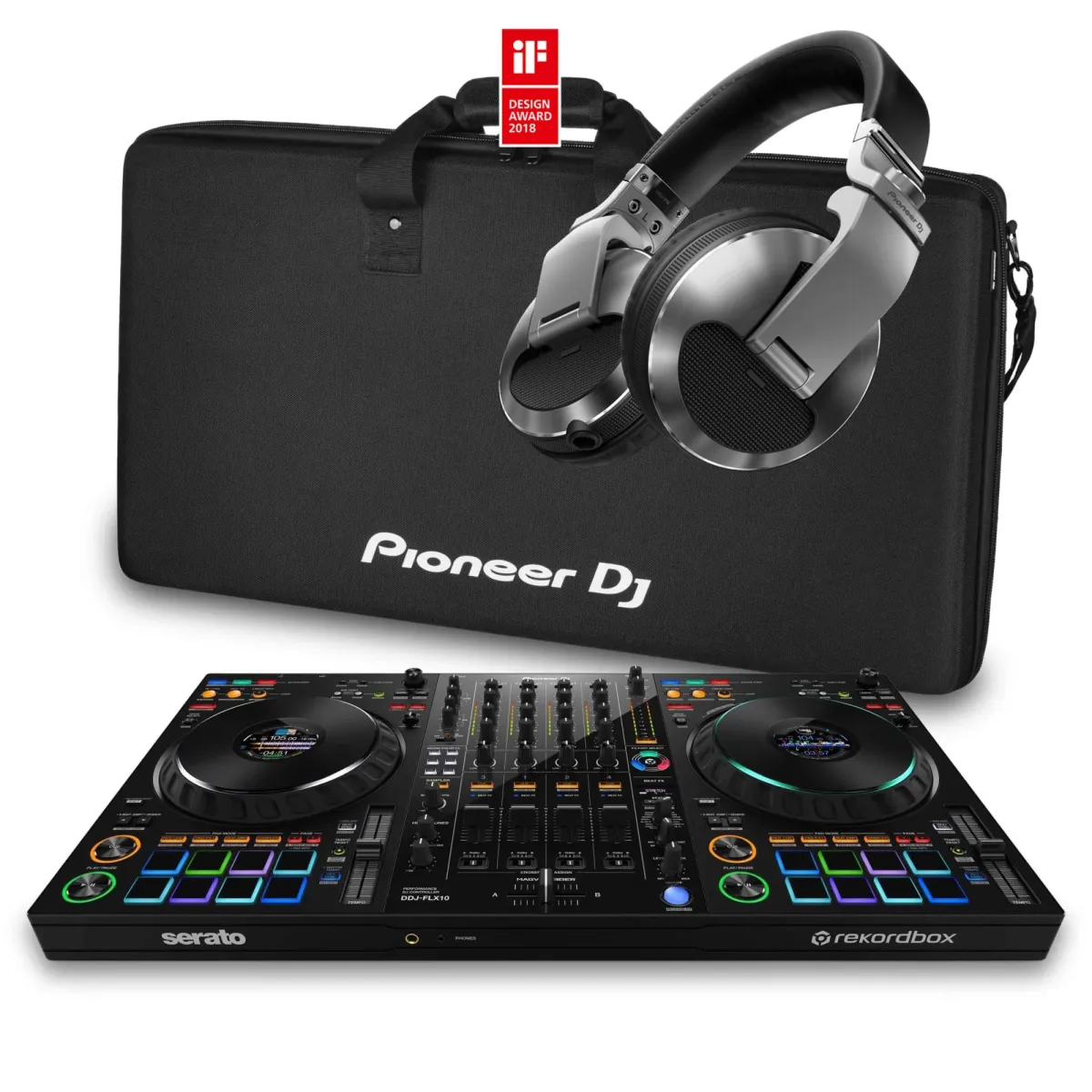 Paket innehållande Pioneer DJ DDJ-FLX10 kontroller i svart, Pioneer DJ DJC-FLX10 väska och HDJ-X10 hörlurar i silver.