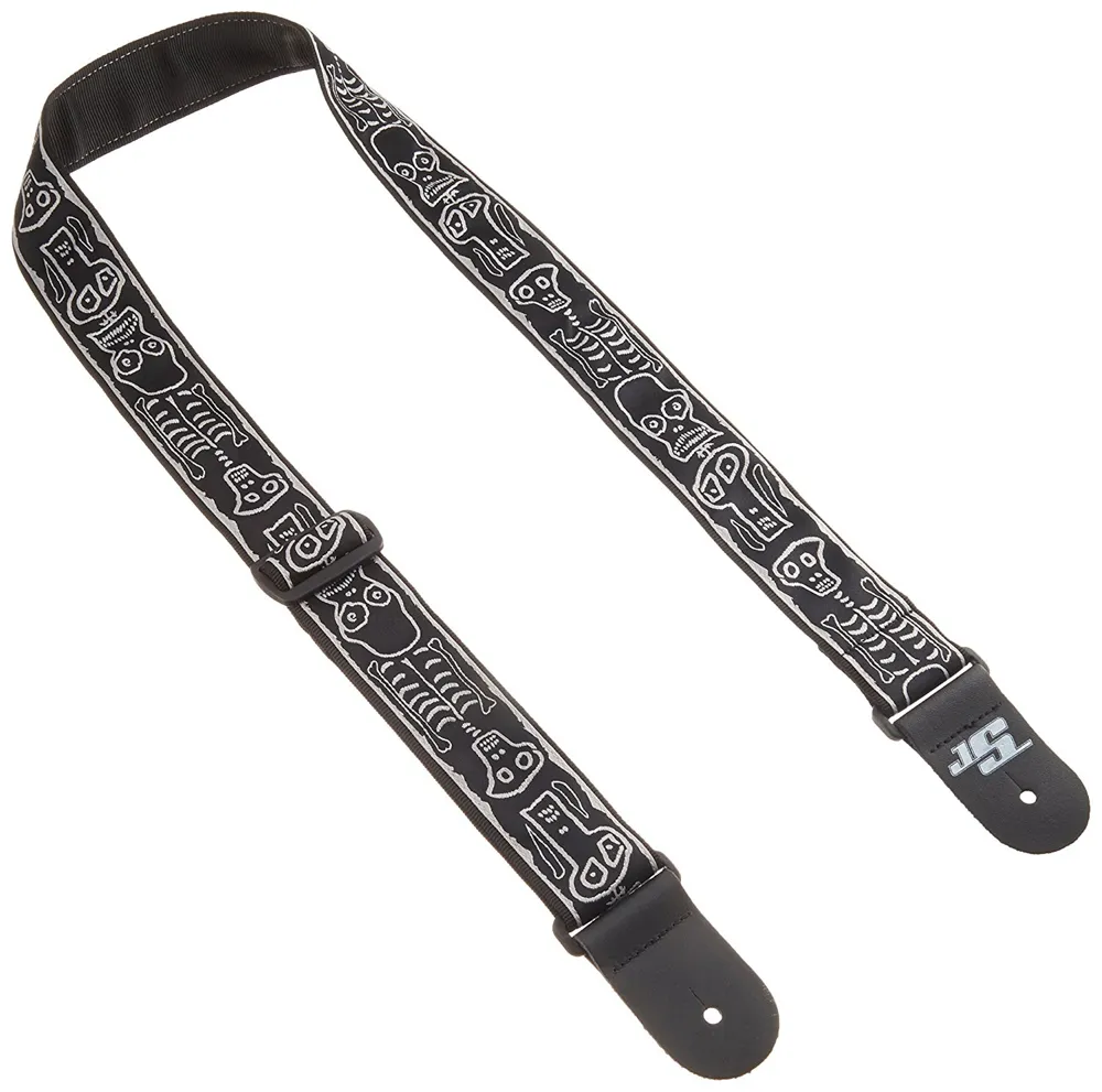 "Skulls n' Bones" illustration, skissad av Joe Satriani själv, gör detta D'Addario axelband till ett unikt tillskott till vilken gitarr som helst.