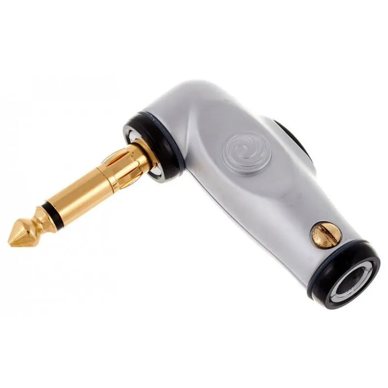 Planet Waves rätvinklig 6,35 mm guldpläterad plugg med strömbrytarknapp. Mute-omkopplaren skyddar utrustningen från höga popljud vid instrumentbyten. Med en knapptryckning kan kabeln bytas utan brus.
