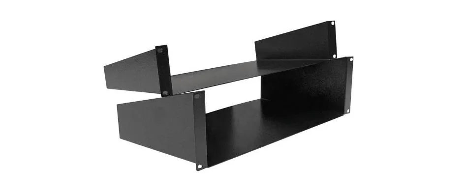 2HE rackhylla för 19-tums rack, svart. Bredd 432mm, djup 255mm, höjd 88mm.