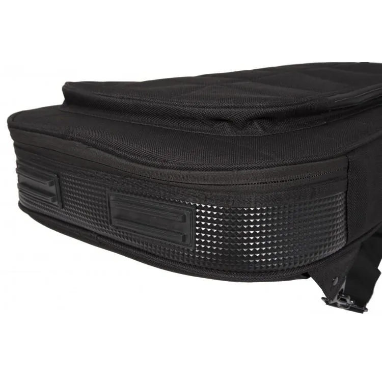 The new ARMOR ESSENTIAL series of guitar bags is the result of a careful analysis of the market regarding the needs of students and musicians who are always on the move, who daily use bags for carrying and storing their musical instruments. Thus a very functional and practical line was born, characterized by the undisputed DH ARMOR style. The bags are made of high quality 1200D “waterproof” Nylon with reinforced stitching, 25mm DHFOAM padding and soft black velvet internal lining. They are equipped with an adjustable neck rest and a large front pocket with a practical Velcro tie to hold the cable.