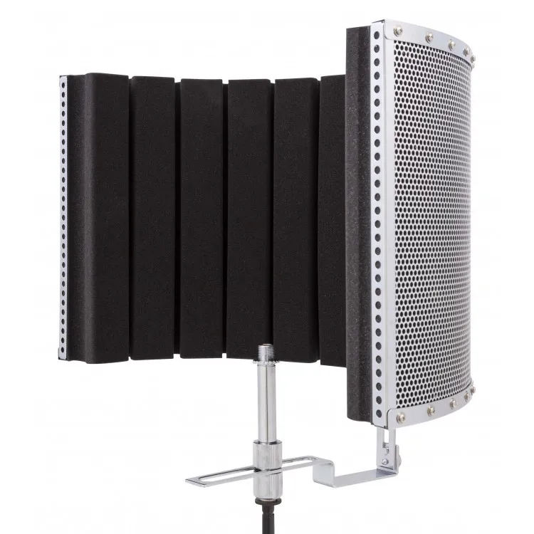 Lättviktsskärm för akustisk inspelning/hemstudio. Skärmen förbättrar ljudet i det akustiska utrymmet runt mikrofonen. Skärmen har en metallinsats med universal 5/8"-gänga för att fästas på ett rakt mikrofonstativ.