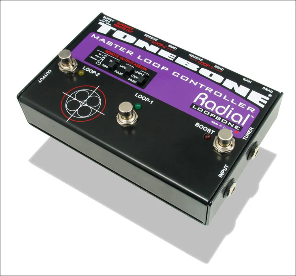 Det är enkelt att använda Loopbone: koppla in dina pedaler och slå på looparna. De två effektslingorna är kopplade i serie för att den första slingan ska kunna matas in i den andra. Detta gör det möjligt för gitarristen att kombinera effekter för att skapa komplexa signalvägar eller ta bullriga pedaler ur den primära signalkedjan när den inte används. För extra kontroll är Loopbone utrustad med Slingshot™, en fjärrkontroll som kan användas för att samtidigt byta kanal på en gitarrförstärkare, slå på en effekt eller aktivera en annan Slingshot-utrustad pedal som Radial Headbone. Föreställ dig bara... en fot stampar och plötsligt aktiveras din refräng, fördröjning och överväxling medan din förstärkare byter kanal! Extrafunktioner inkluderar en inbyggd kraftförstärkare med "ställ in & glöm" nivåkontroll för solo, plus en separat buffrad tuner ut för "on-the-fly" justeringar.