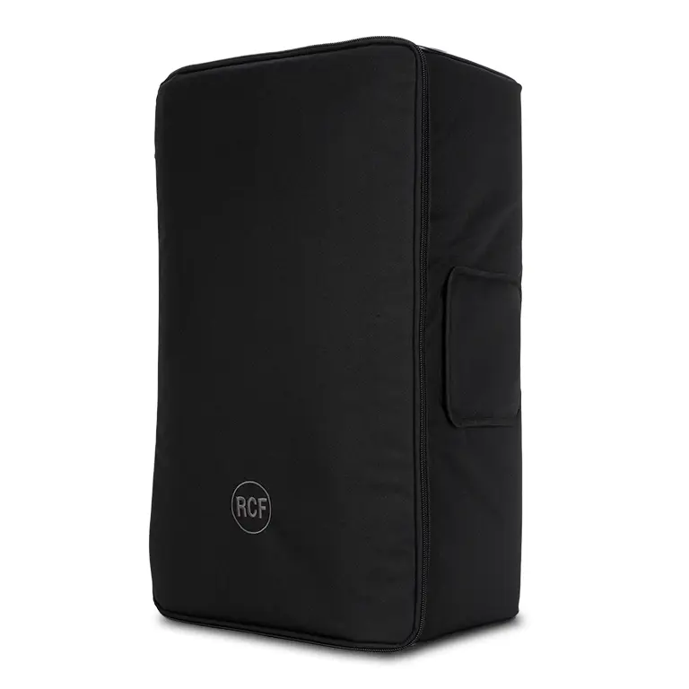 Padded Cover for ART 9 Series 15" models. It features heavy-duty weatherproof polyester outer fabric, foam rubber padding, and zip openings with Velcro fasteners. The frontal cover can be opened and blocked with velcro on one side. It features multiple openings for handles, for the rear connection panel, and the pole mount cap.