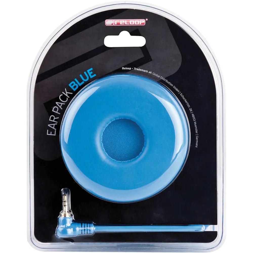 Det blå Ear Pack från Reloop består av en helixsladd och ett par öronkåpor med litet urtag för individualisering av ens hörlurar. Den är lämplig för RHP-10, RH-3500 Pro MK2 och RH-3500 Ltd hörlurar.