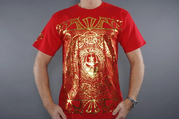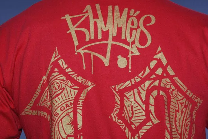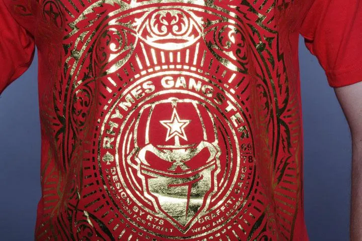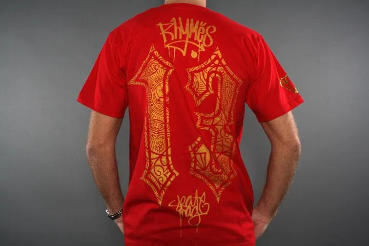Handgjord t-shirt med stort tryck fram och bak. Detailjer i guldfolie. 100% bomull. Röd, medium.
