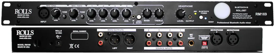 The RM169 is a six channel Professional audio mixer with Bluetooth input. Two microphone inputs, and four stereo line RCA inputs, the RM169 is ideal for any installation where space is a consideration, without compromising audio quality. The Bluetooth input has extended range and exceptional audio quality. RCA and XLR balanced outputs jacks make the RM169 perfect for any application.