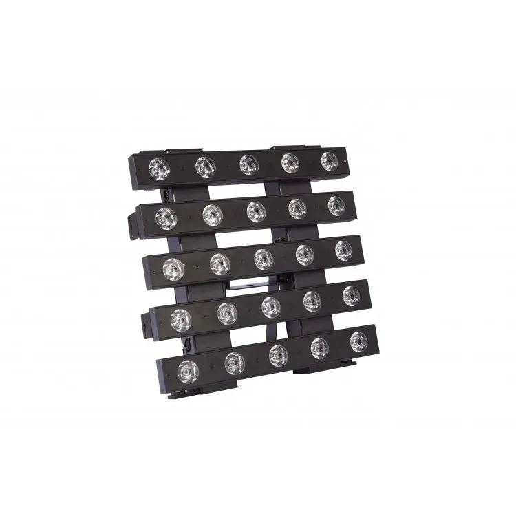 The PIX.i series has been designed by transferring the many needs of the live entertainment world in the indoor club entertainment industry, letting the occasional and non-occasional user to approach the “pixel to pixel” control with a pair of innovative 5x5 matrices, easy to use and install. PIX.i 5 White Beam is a 25 pixel LED matrix with a high power 3W Warm White 2800K source. The optics, conceived with a beam projection angle of 5°, is equipped with an anti-reflection DC (dark cover) optical insulation system which ensures a precise and defined pixel effect, without any internal reflection interfering in the light effect. For an ultra easy-to-use experience, many macros have been included, which can be recalled via DMX with graphic pixel effects such as letters of the alphabet and numbers. A colour LCD display features an intuitive software interface, a black aluminium body with “fast lock” hardware for the connection of the modules ensures low weight and perfect alignment between the pixels.