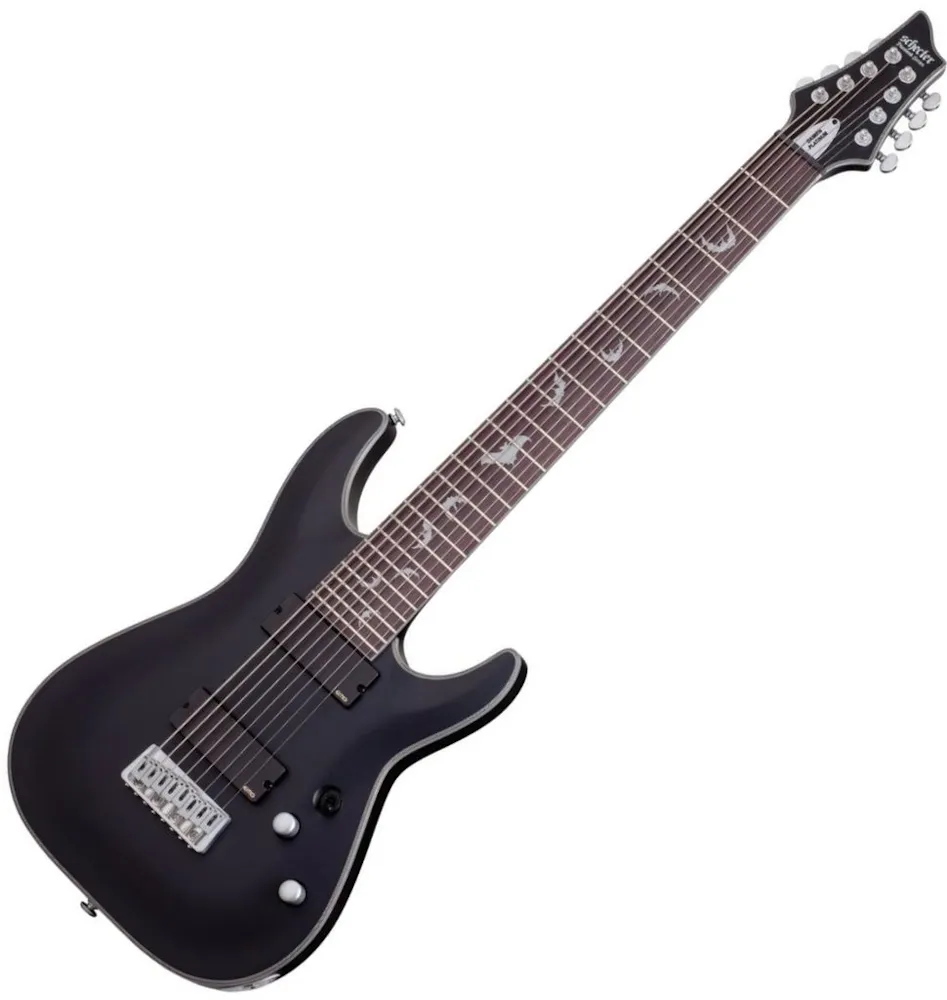 Schecter Damien Platinum 8-strängad elgitarr har en kropp i mahogny med dubbelt utskuren kropp, en 3-delad lönnhals med kolfiberförstärkningsstänger och en greppbräda i rosenträ med 24 band. Den är laddad med kraftfulla EMG-808 aktiva humbuckers som är designade speciellt för 8-strängade gitarrer för alla tunga rocktoner du behöver. Grover tuning maskiner med en TonePros tune-o-matic brygga ger tuning stabilitet och tonal sustain. Elgitarrens utnämningar inkluderar fladdermusinlägg, flerskikts greppbräda och kroppsbindning och satinkrom hårdvara.