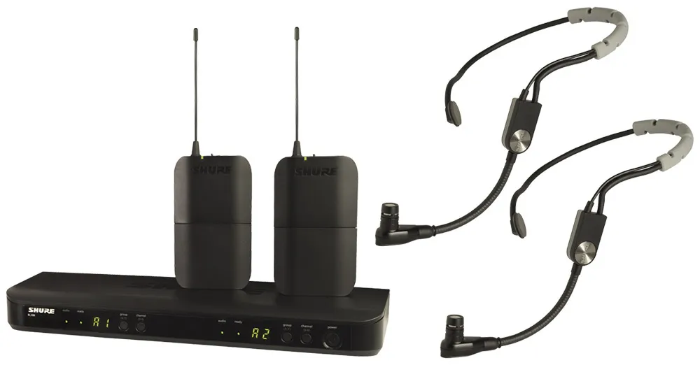 Shure BLX188E/SM35 Combo S8, SM Headset Series, UHF Wireless-System with 2x BLX1 pocket transmitter, 2x SM35 condenser headset microphone, cardioid, up to 3 Systems parallel, Pilottone, antenna-Diversity, Quick-Scan to find free frequencies, pocket transmitter with 4 Pin TQG connector, receiver with plastic housing, internal antennas, XLR- and Jack outputs, Audio Status-LEDs, frequencyrange S8 823 - 832 MHz