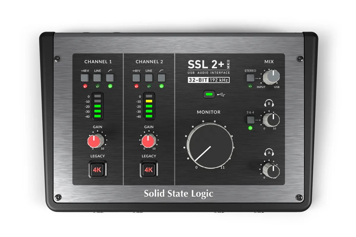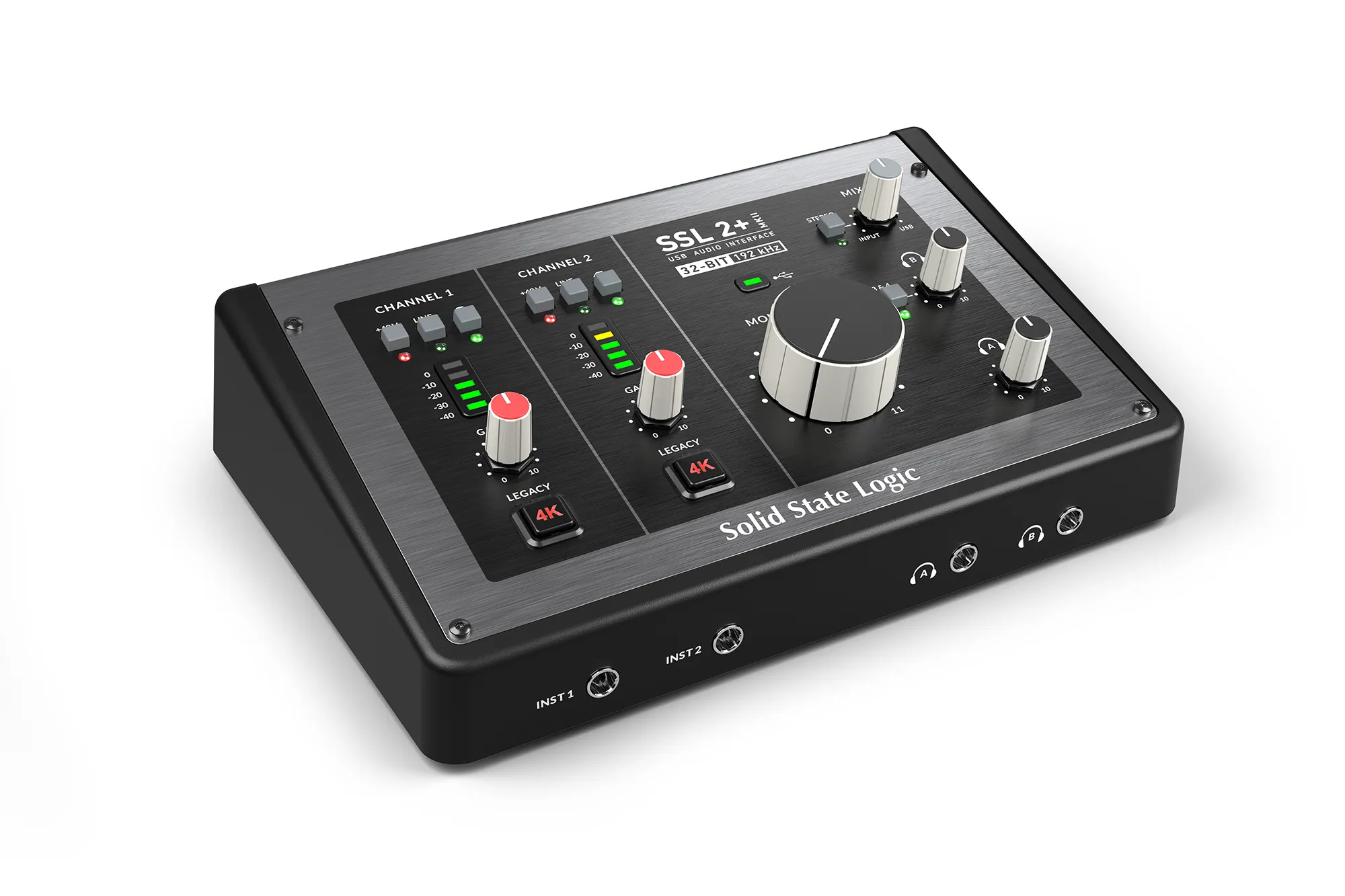 SSL 2+ MKII är utrustad med två högpresterande SSL-designmikrofonförförstärkare som levererar ett enormt 64 dB förstärkningsområde, i kombination med klassledande 116,5 dB dynamiskt omfång och -130,5 dBu EIN. Mic-pre's kan även fungera i LINE-läge för att ansluta syntar eller INSTRUMENT-läge för att ansluta gitarrer/basar.