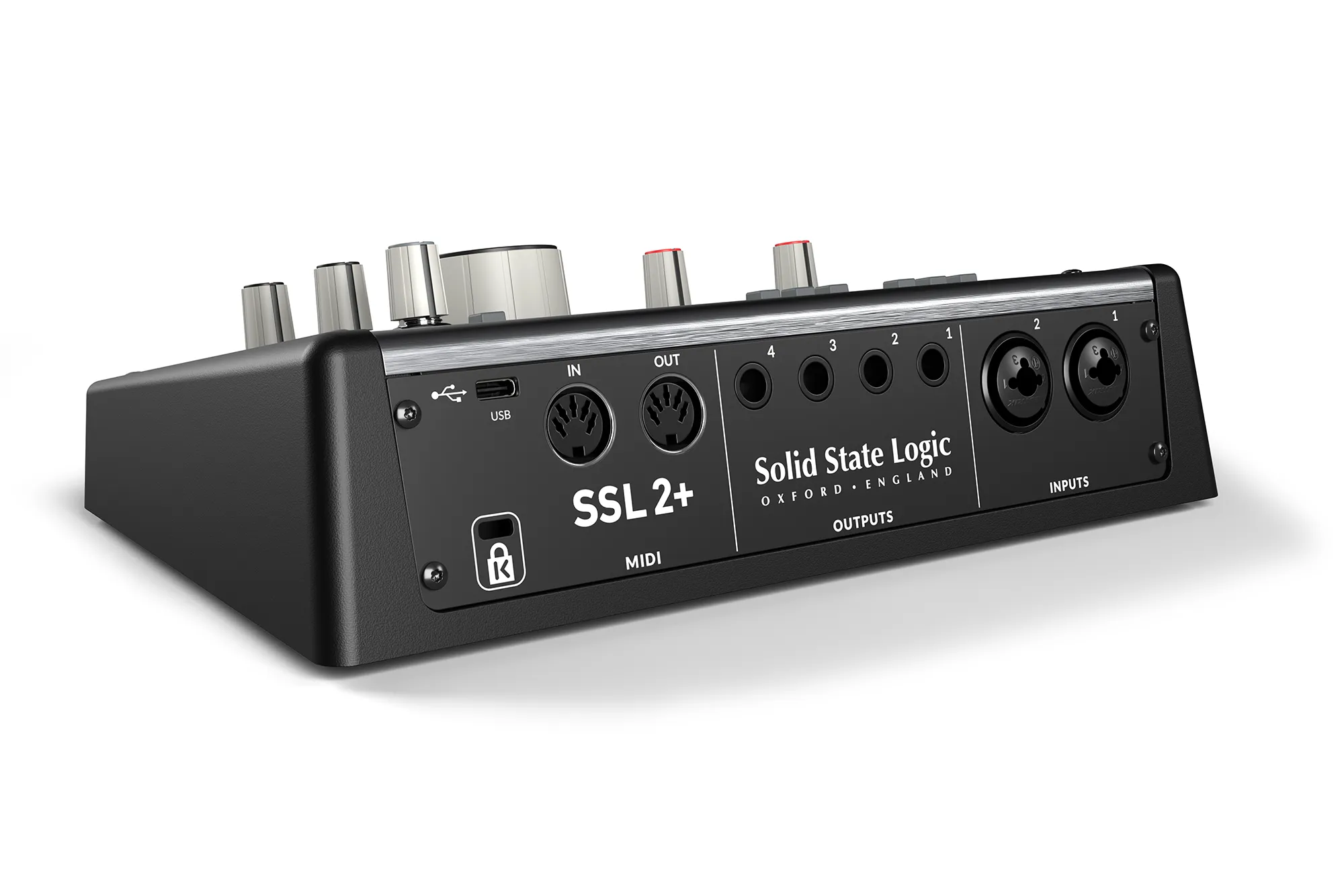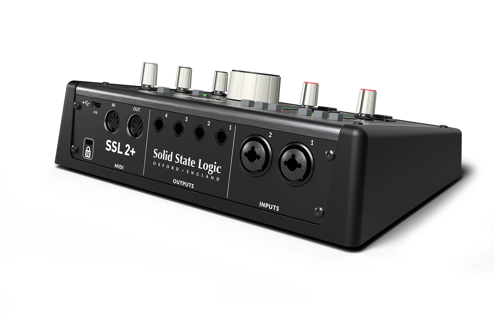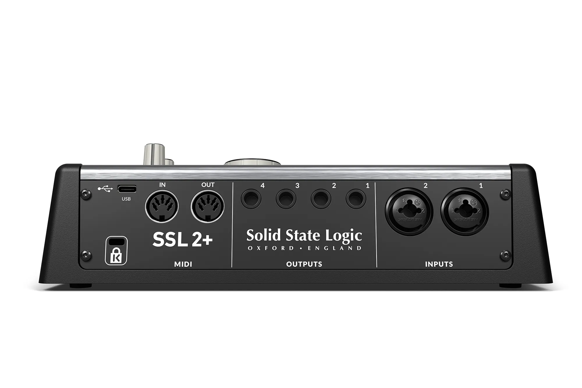 På baksidan har SSL 2+ MKII Neutrik XLR Combo-uttag för Mic/Line-ingångar, fyra balanserade utgångar, 5-stifts DIN MIDI I/O och USB-kontakten.