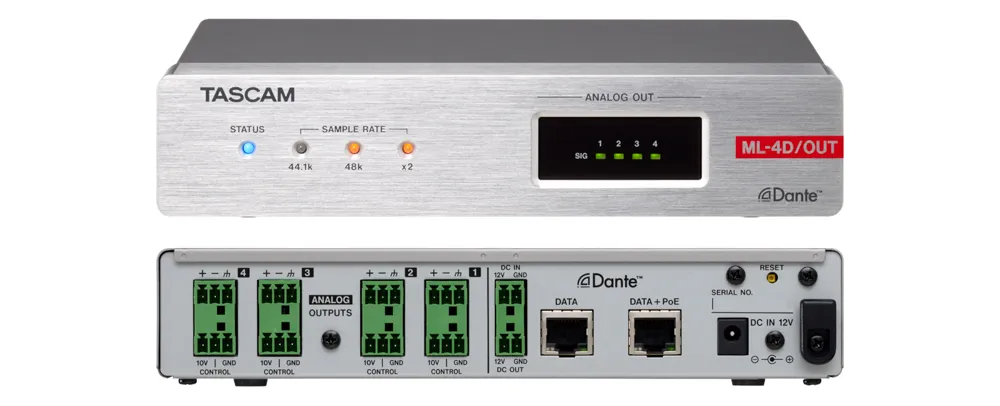 ML-4D/OUT-E är en kompakt omvandlare som omvandlar Dante-insignaler till 4-kanaliga linjeutgångssignaler. Med hälften så stor som ett standard 1U-rack är ML-4D/OUT-E lämplig för olika Dante-system som en utsökt analog utgångsenhet. Den inbyggda DSP-mixern gör att småskaliga system kan fungera fullt ut med en mängd olika in-/utgångsmodeller som TASCAM Dante Compact Processor Series erbjuder. ML-4D/OUT-E stöder upp till 96kHz/24bit och använder Euroblock-kontakter för analog linjeutgång.