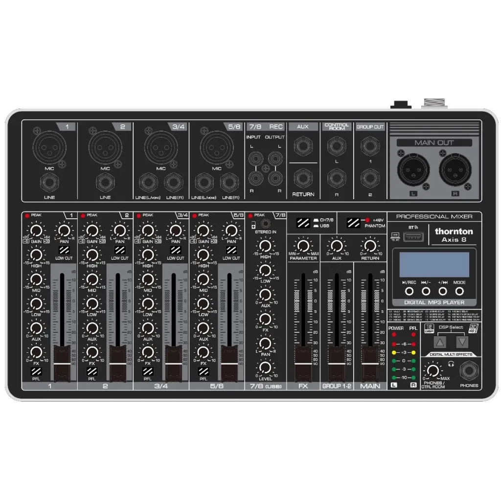 Denna kompakta Axix 8 har 8 kanaler, varav de första 4 kanalerna har både inbyggda mikrofonförstärkare med balanserade XLR-kontakter och linjeingångar. Kanal 3/4 och kanal 5/6 kan användas som rena stereoingångar för tangent instrument och annan utrustning med stereosignal. Medan kanal 7/8 är en stereokanal med phono/RCA- och TRS minijack-kontakter för olika mediaspelare eller annan DJ-utrustning. Om du ansluter en MP3-spelare, via kabel eller USB, styrs ljudet från kanal 7/8.