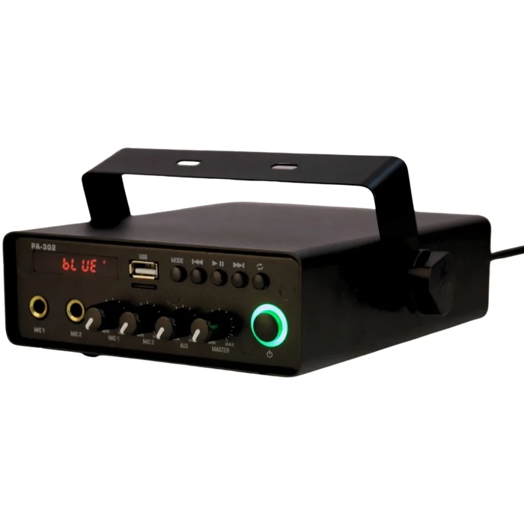 PA-302M har en robust design som är både lätt och hållbar. Dess kompakta storlek betyder att den kan placeras nästan var som helst, vilket gör den idealisk för både stationär och bärbar användning. Observera att enheten inte är vattentät, så den bör användas i torra miljöer.