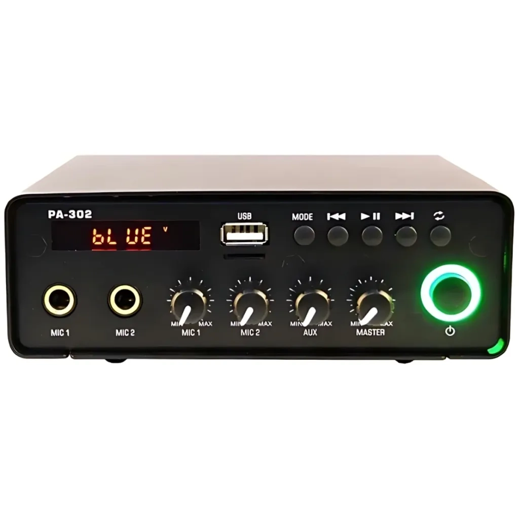 PA-302M är idealisk för kommersiella miljöer som små kaféer och stormarknader, där den kan användas för att skapa en behaglig atmosfär med bakgrundsmusik eller för att sända meddelanden över PA-systemet.