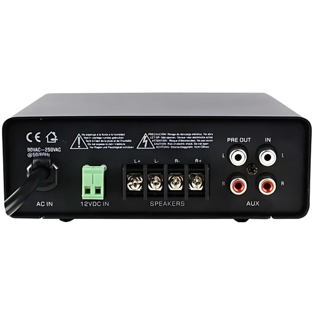 Förstärkaren är utrustad med flera ingångsmöjligheter, inklusive AUX och två mikrofoningångar, var och en med sin egen volymkontroll. Den har också en MP3-spelare med SD- och USB-portar, vilket ger användarna ett brett utbud av möjligheter att spela sin favoritmusik från olika källor.