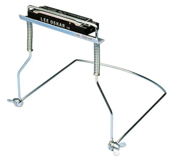 Justerbar munspelshållare för bluesmunspel och andra 10-hålsmunspel. Stabil låsning. Kan fällas ihop för att förvaras i ytterfacket på en gitarrbag.
