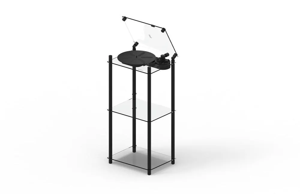 Tillverkad i högkvalitativt aluminium och härdat glas smälter Turntable Table sömlöst in i alla hem. Med sin klassiska, minimalistiska estetik är detta en möbel skapad för att vara en tidlös mittpunkt – den lyfter din lyssningsupplevelse och tillför elegans till rummet.