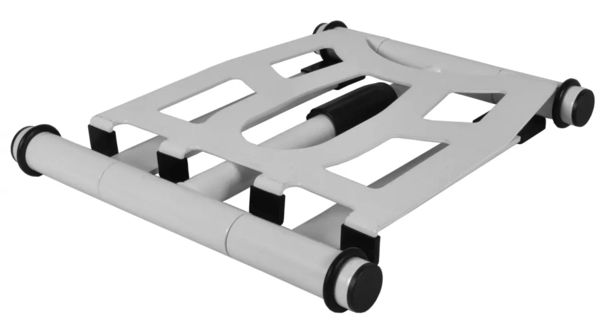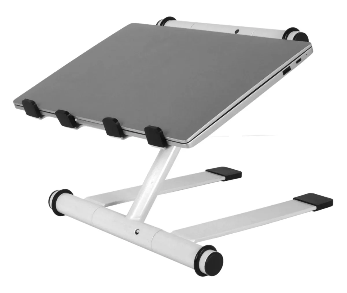 Dess 4-stifts roterande bricka har en halkfri yta för att hålla den bärbara datorn säkert i krävande miljöer. Stativet har en teleskopisk höjdjustering på 23 till 35 cm (9,1 - 13,8 tum) och kan vikas platt utan lösa delar, vilket erbjuder bekvämlighet och bärbarhet.