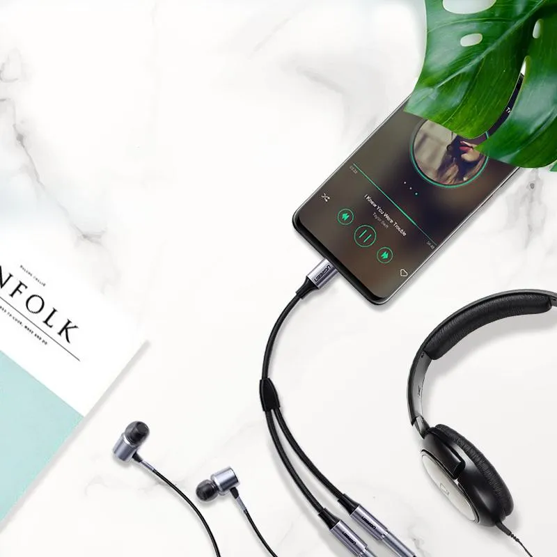 Anslut två par 3,5 mm hörlurar med en USB C-ingång med Ugreen-adaptern. Enheten ger högkvalitativ ljudöverföring.
