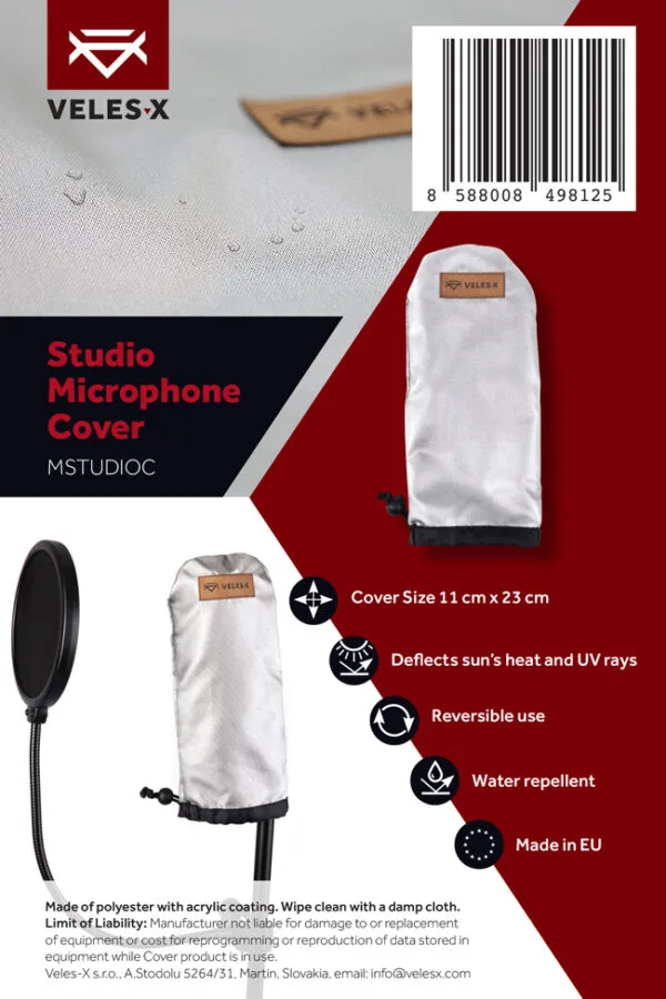 Din mikrofon är viktig, skydda den från damm, smuts och sol. Veles-X produkter erbjuder alltid något extra. Universell dubbelsidig design mot damm. Den silverfärgade sidan, lämplig för användning på scen, förhindrar att mikrofonen överhettas och reflekterar UV-strålning, vilket säkerställer att originalfärgen behålls. Den svarta sidan fungerar som dammskydd för hemmabruk. Höjd: 24 cm, bottenbredd 12 cm. Den nedre delen av studiomikrofonskyddet är försedd med en dragsko. Denna produkt är vattentålig för att förhindra oönskade skador på den täckta mikrofonen. Rengör endast med en fuktig, ren trasa.